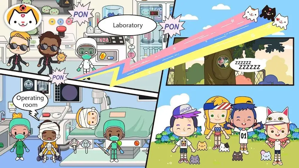 Miga Town: My Hospital MOD offers six scenarios to explore, each with its own characteristics and challenges. These include the hospital entrance, general departments, laundry, the baby care floor, the laboratory and treatment area, and an outdoor scenario.